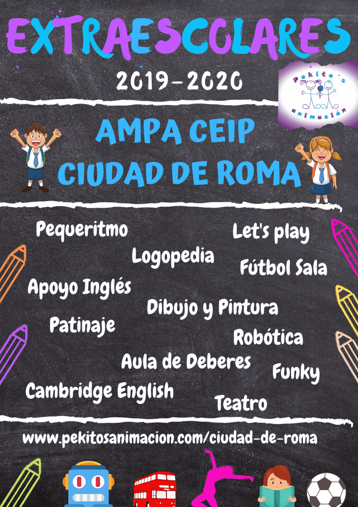 CIUDAD DE ROMA A continuación, pueden consultar todas las actividades que realizamos en su colegio, y descargarse los documentos oportunos. FICHA DE INSCRIPCIÓN EXTRAESCOLARESDescarga Compártelo: Compartir en X (Se abre en una ventana nueva) X Comparte en Facebook (Se abre en una ventana nueva) Facebook Me gusta Cargando...