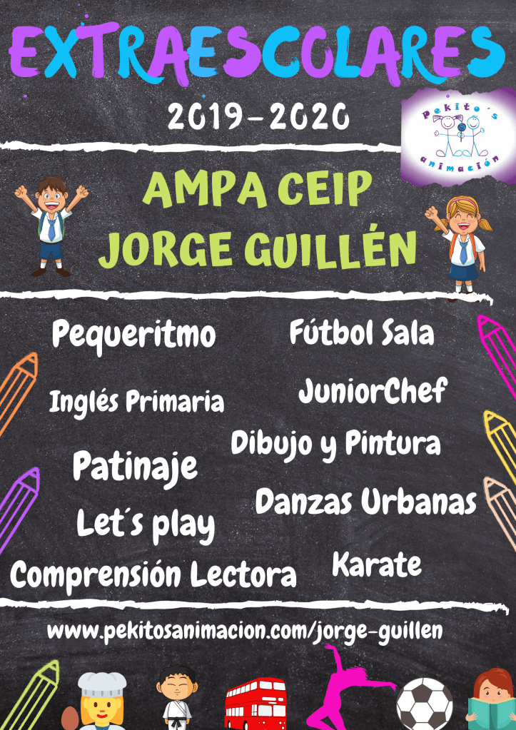JORGE GUILLÉN A continuación, pueden consultar todas las actividades que realizamos en su colegio, y descargarse los documentos oportunos. Ficha de inscripción EXTRAESCOLARESDescarga Consulta con tu AMPA para más información Compártelo: Compartir en X (Se abre en una ventana nueva) X Comparte en Facebook (Se abre en una ventana nueva) Facebook Me gusta Cargando...